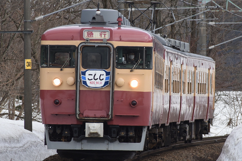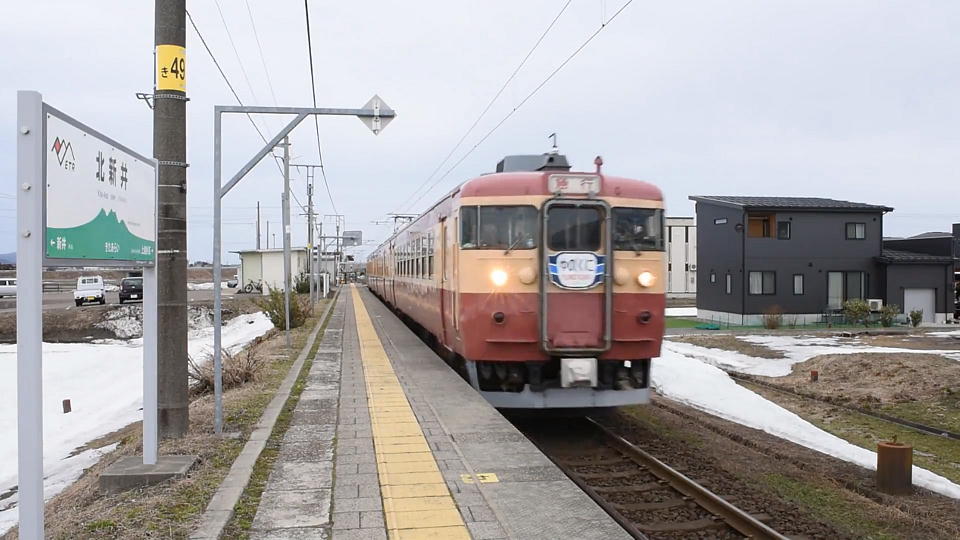 | 新井駅へひと駅移動し、妙高高原からの下り快速を撮影する。 1番左は、快速のあとに発車する、新井始発の特急「しらゆき3号」。 真ん中は、妙高高原行きの鈍行。新井で快速と交換する。 快速が新井を発車する約28秒の動画はこちら。 |