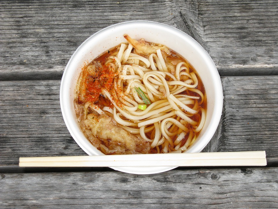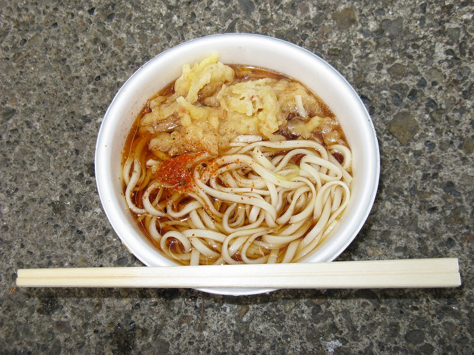 | 昨日は新潟からまた信州に戻り、今日も軽く撮影に出かける。 いつもの「う・そ自販機」の天ぷらうどんだが、 今回は随分つゆが少ない気がするよ(笑)。 日曜日ということもあってか、次から次へと客が来て、 みんなおもしろがって喰っていた。 |