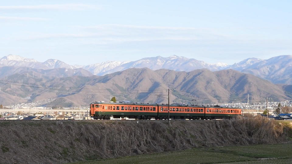 | 【おまけ】 長野で折り返した湘南色の撮影のため、 築堤ポイントに先回りした。 この場所は俺の後ろにすぐ山があることから、 17時を過ぎて手前からみるみる陽が陰ってきたが、 まぁ何とかギリギリで列車に陽が当たってくれた。 約18秒の動画はこちら。 |
