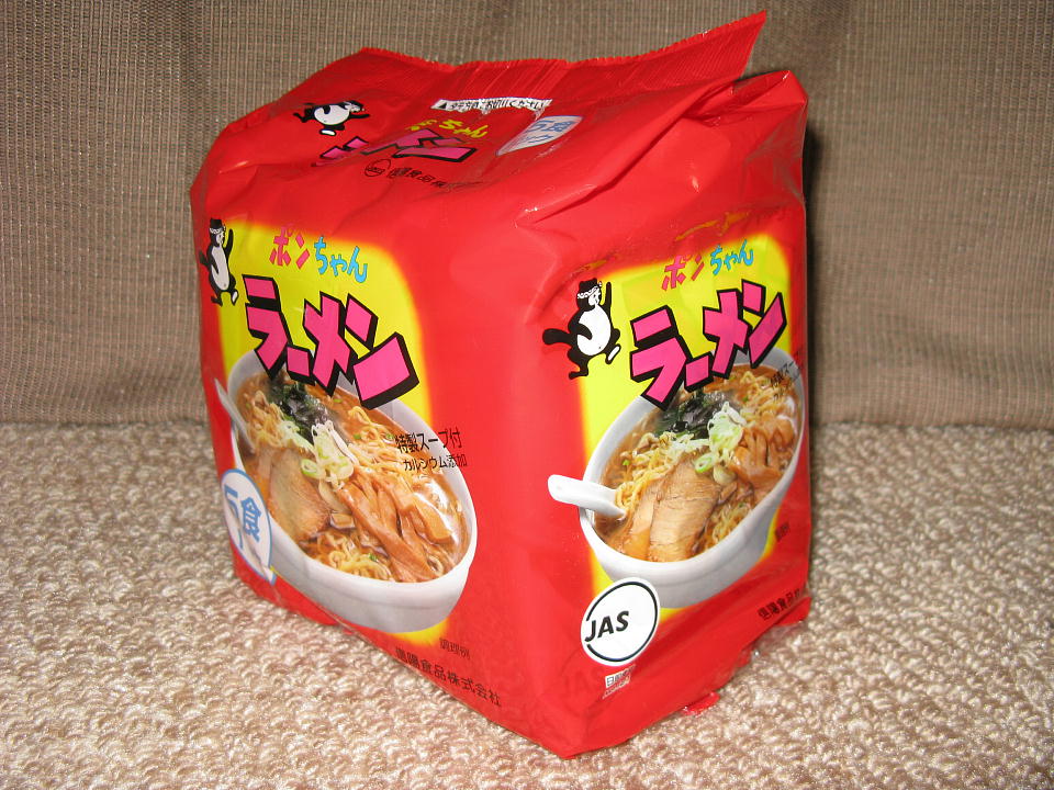 | 【余談】 これが「ポンちゃんラーメン」。 基本的に5食パック。 写真のしょうゆ味の他にみそ味もあるよ。 さらに、しょうゆ味とみそ味のカップタイプもあり、 さらにさらにミニカップもあるのだよ。 カップはレアだけど、袋入り麺の5食パックなら 長野市内のスーパーで消費税分込み300円台で買えます~。 しょうゆ味はクセがなく、あえて言えば(書けば) サッポロ一番のしょうゆ味にいくらか近い味かな。 うちの常備ラーメンだ(笑)。 |
