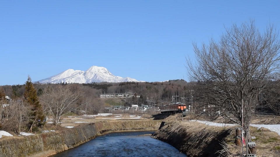 | 同じ下り快速を、別なアングルでも撮影した。 多くのテツにとっては、こっちの方がフツーなんだよね(笑)。 画像の下に7個あるロウソクみたいなカタチをしているのが、 雪の時期に活躍していたスプリンクラーだよ。 もう雪が溶けてしまっているので、今は稼動していない。 約32秒の動画はこちら。 |