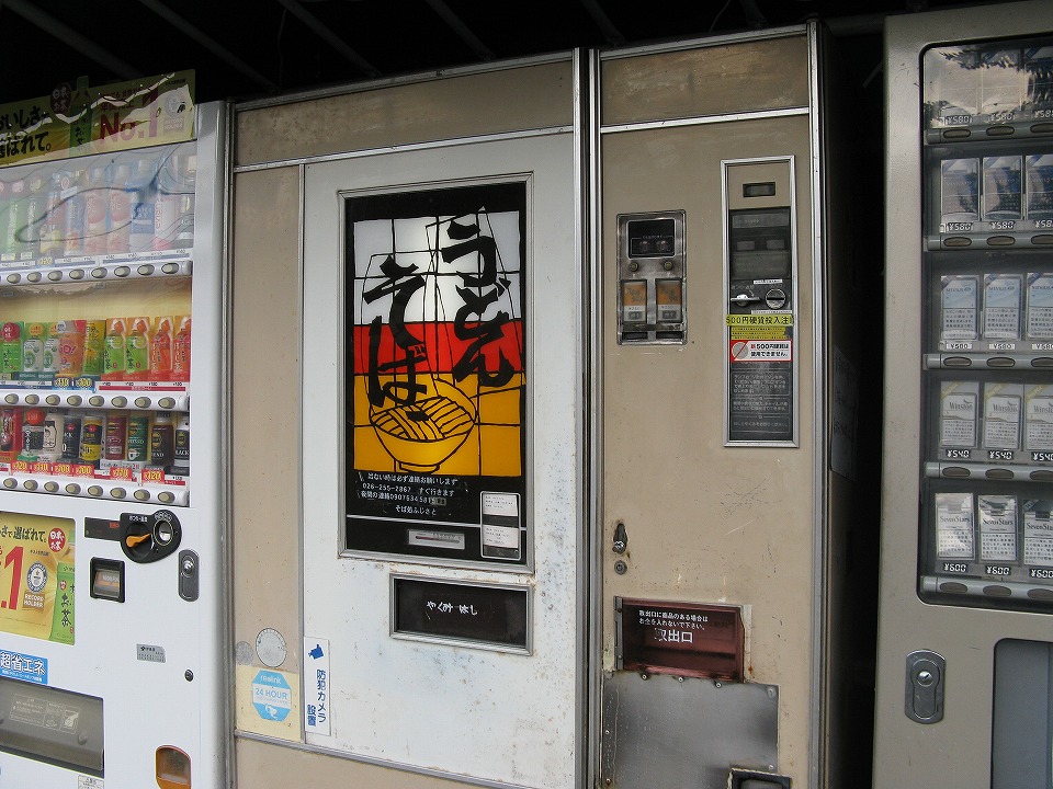 | さて、翌日。 今日も元気に撮影に行くよ。 昨日の予報では曇りそうだったけど、思っていたよりも晴れている。 いつもの「ふじさと」の「う・そ自販機」で朝メシを喰っていくべ。 |