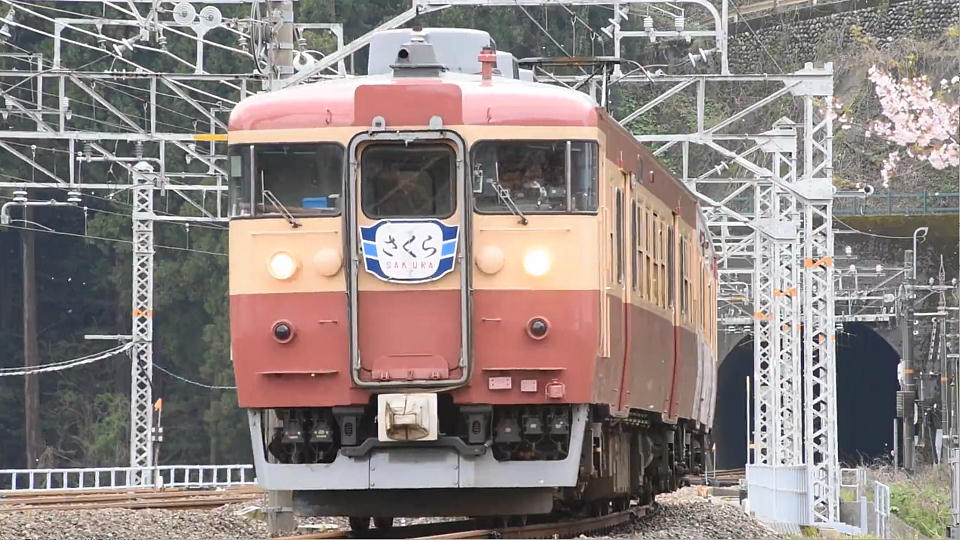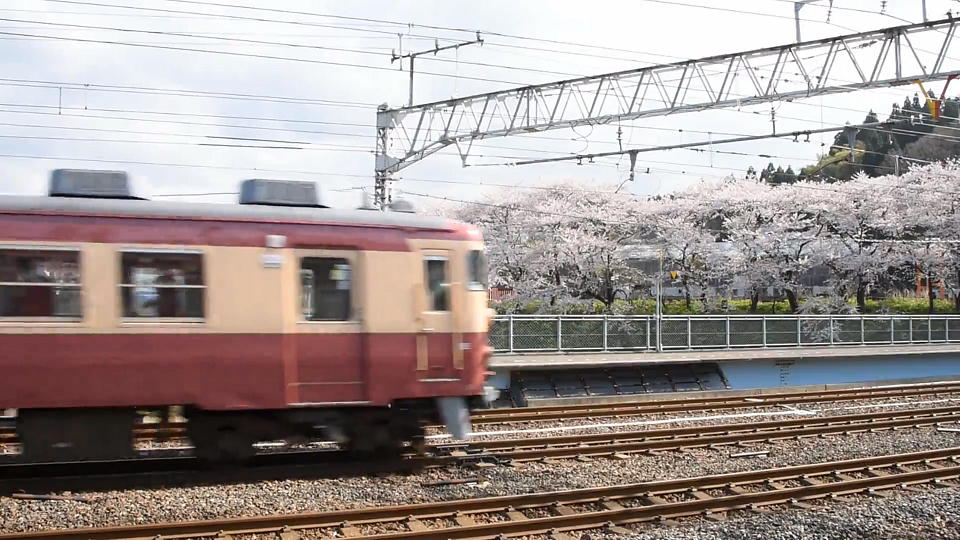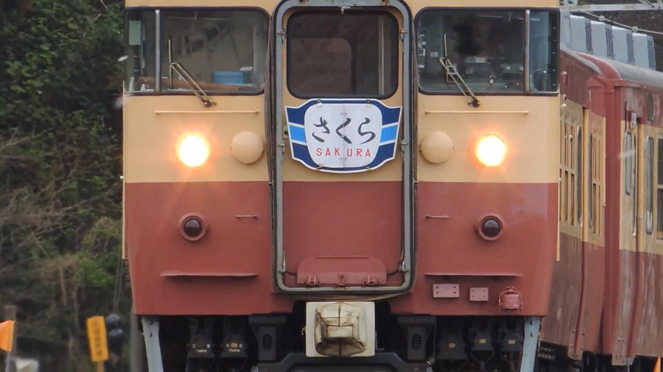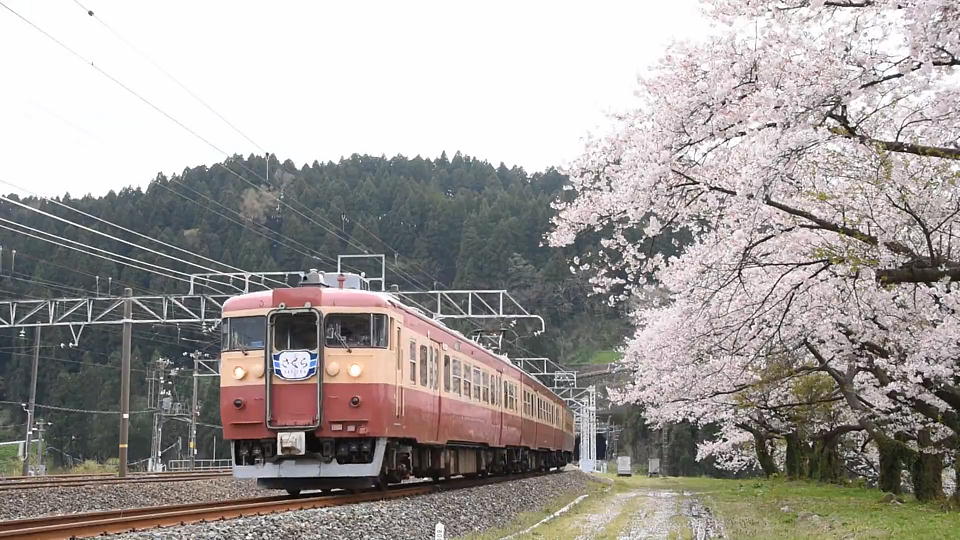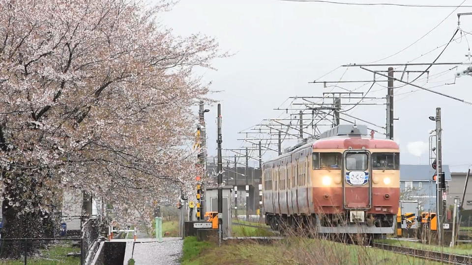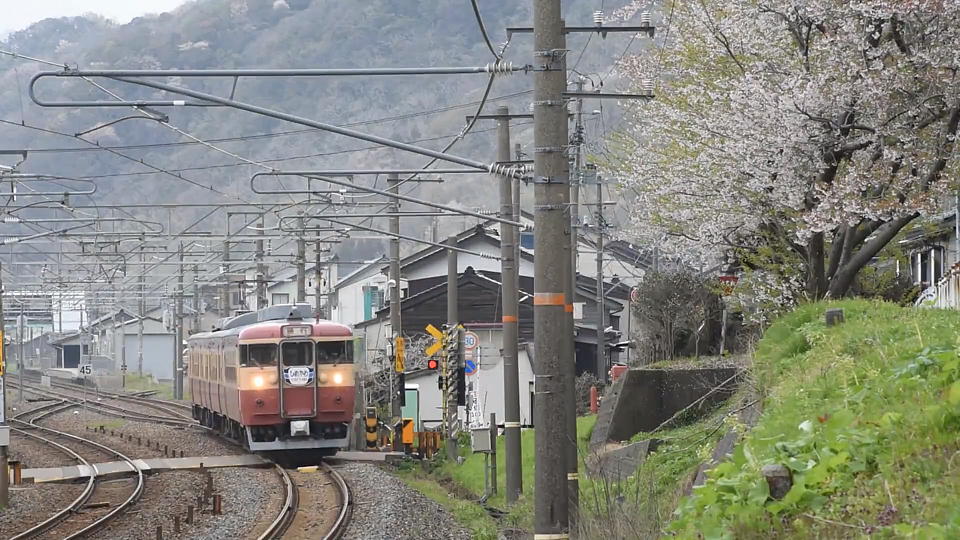 | 快速の撮影後、谷浜に移動して桜と「急行1号」を撮影。 花は半分ぐらいが散ってしまっている…。 約39秒の動画はこちら。 |