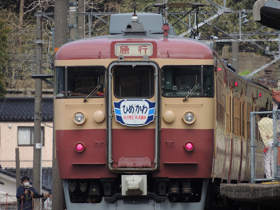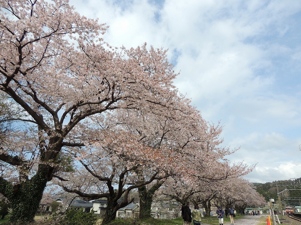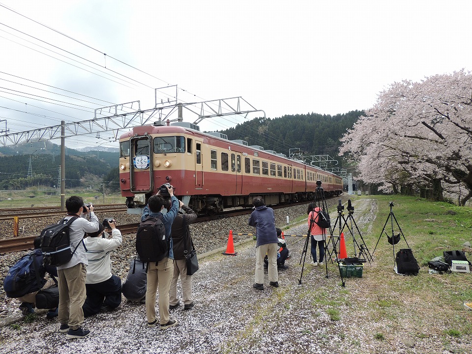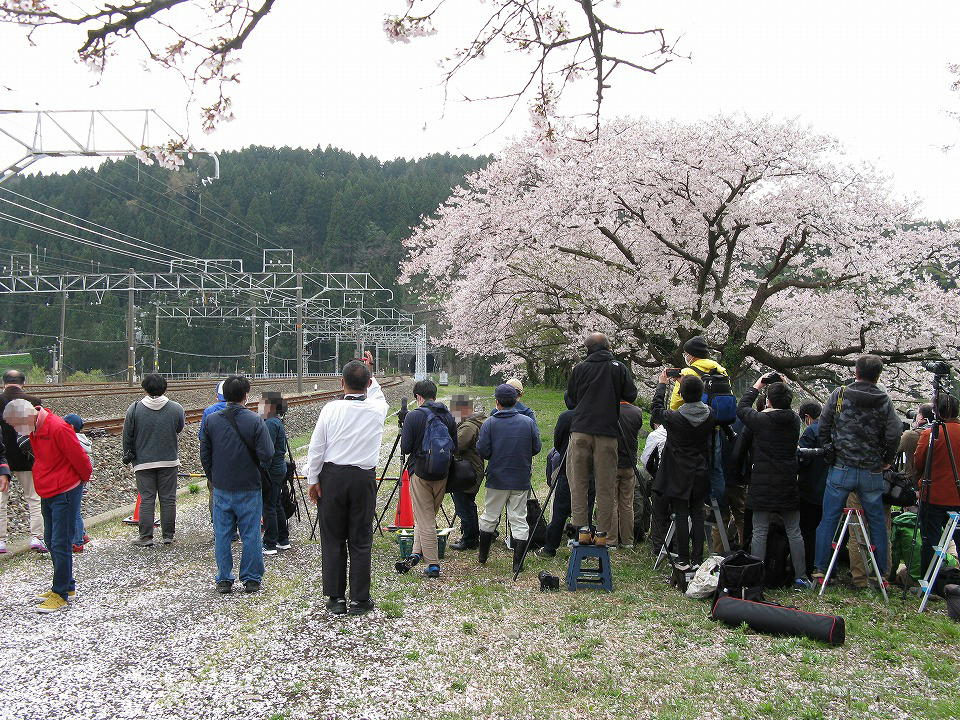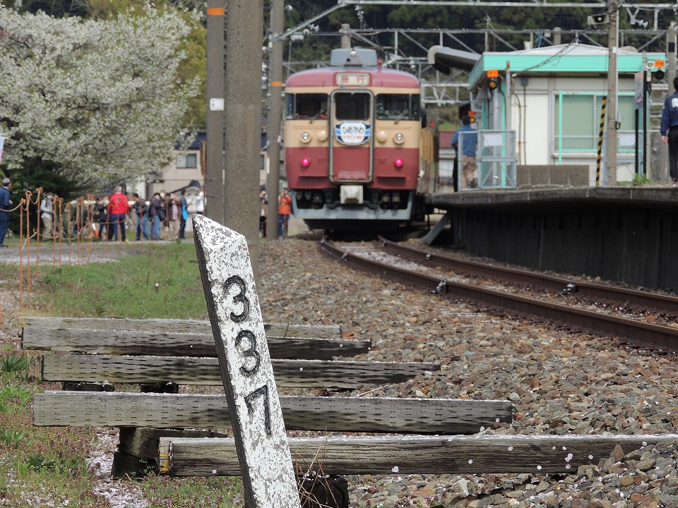 | 姫川での撮影を終えたら、今日もやってる能生駅でのイベントに参加した。 先週は「高み」から見物したイベントに今回は参加ってこと。 桜は散り始めだが、まだ十分に撮影に耐えられる花の量でよかった。 おマニアさんがたくさん来てるよぅ(ヒトのこといえるか!)。 「急行2号」の到着まで、しばし待機だ。 お天気は、雨は止んで時折陽が射すものの、まあ曇りってとこですね。 |