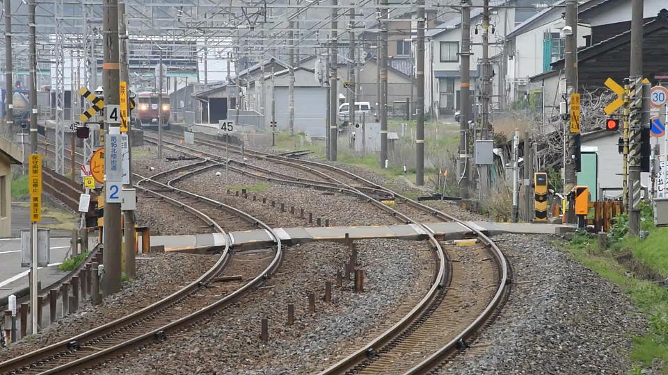 | 今度は失敗しないように十分に気を付けながら 下りの快速を撮影。 露出はかなりオーバーめに設定している。 実際は、辛うじて雨が降っていないという程度の天気で、どんよりと暗い。 約18秒の動画はこちら。 |