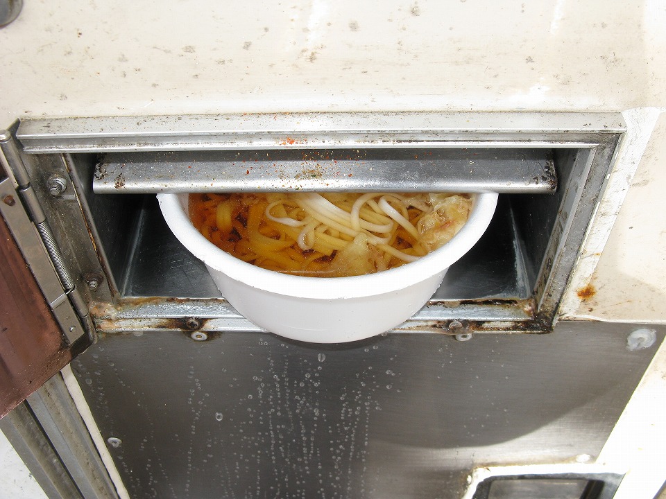 | 名立駅での撮影を終えたら今度こそ信州に帰る。 でも、先輩が 『直江津の「つかそば」を案内ぶて』 とウルサいので さっき「あさひ楼」で喰ってまだ間もないのにやってきた。 ホントは俺が喰いたくて誘導したようなもんなんだけどね。 わはは。 お馴染みの「玉子中か」280円ナリと、おむすび(あったかい)90円ナリ。 先輩の分も「仕返し」した(笑)。 |