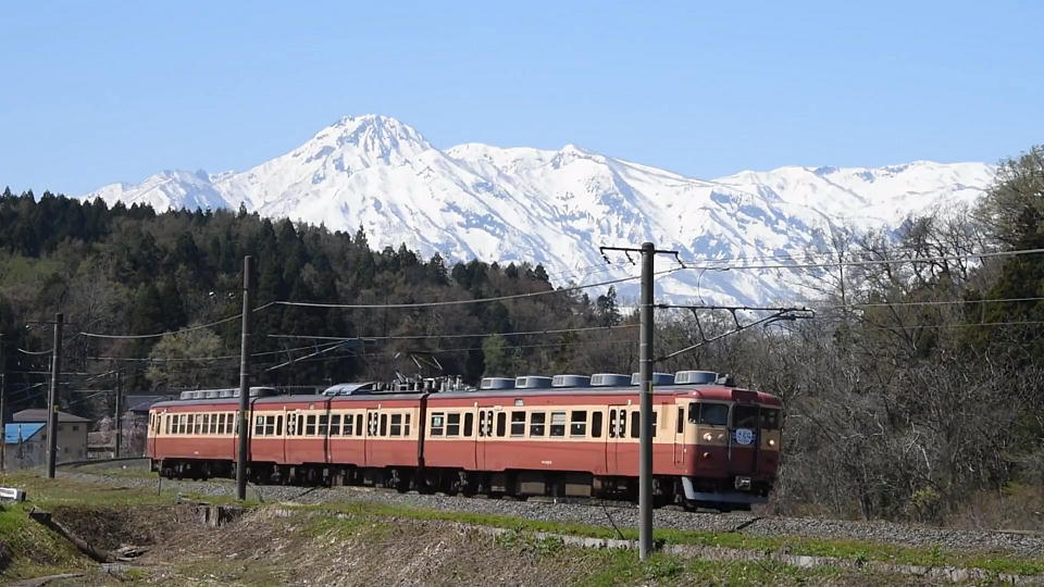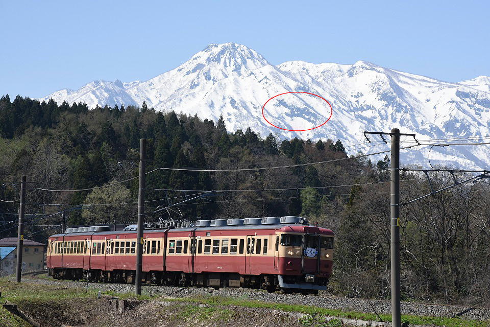 | 「う・そ自販機」でちょっと時間を取られたので、 上りの快速の撮影に間に合うように高速でサクッとワープして、 妙高山をバックに撮影できる上越市のポイントに来た。 早春の妙高山には「跳ね馬」と呼ばれるネガタイプの雪形が現れ、 昔は地元の農作業スタートの目安になっていた。 トキ鉄の「妙高はねうまライン」の名称もここから来ている。 ちょうど雪解け時期の今、この「跳ね馬」が出現しているので、 コイツと一緒に「はねうまライン」を走る快速を撮りたい、という企画だ。 上り快速と撮るには撮れたが、カメラから電車までの距離が近くすぎて、 イメージしていたアングルとはかけ離れていた…。 約13秒の動画はこちら。 この画像は動画からのキャプチャーで、妙高山の中腹に赤○で囲ってある部分が その「跳ね馬」。 左に向かって跳ねている馬に見立てているのね。 |
