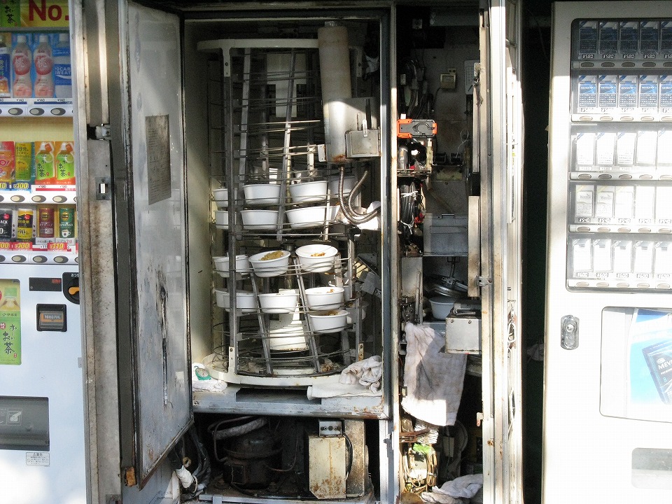 | さて、翌日曜日。 朝、信州はとりあえず晴れていた。 先輩をお迎えに行き、いつもの「う・そ自販機」でモーニングを、 と思ってきてみたら、あらら、整備中。 でも、おかげで「う・そ自販機」の中を撮影できた。 メンテをしているオヤジさんは、写真中央上のボトルにめんつゆの補充などをしてたよ。 いつもありがとうございます。 |