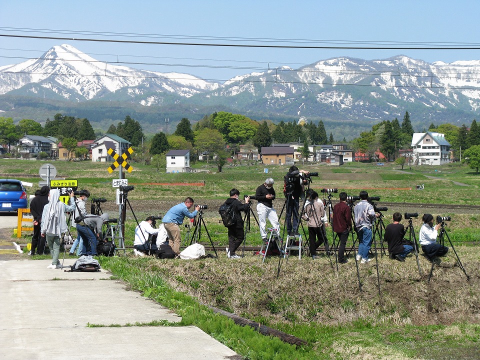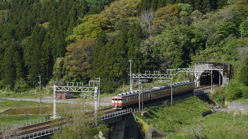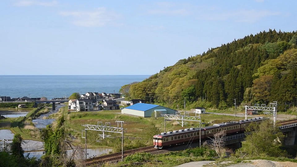 | 名立の俯瞰ポイントで「急行2号」の撮影。 今日はそこそこ天気がよく、逆光が激しいのでPLフィルターを使った。 「急行2号」の到着時の約35秒の動画はこちら。 |