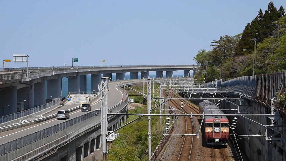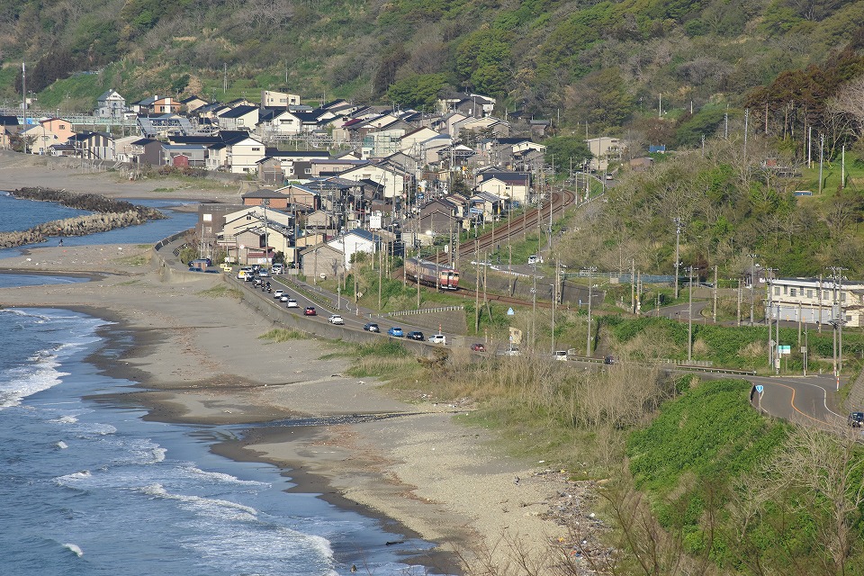| ♬投げ岩が見え~てき~た 親~知らずも近~い~ 快速の撮影後、いつものように高速でワープして「急行1・2号」のみが走る 糸魚川以西に来たのだが、国道8号の例の片側交互通行の信号に引っかかった。 普段なら交通量がそれほど多くはないため、 1回待てば通過できるところ、GWなのでクルマがどんどん溜まってしまい、 3回も待ってしまった。 ただでさえ、1回の待ち時間が数分もあるから、 通過に結構時間がかかってしまった。 |