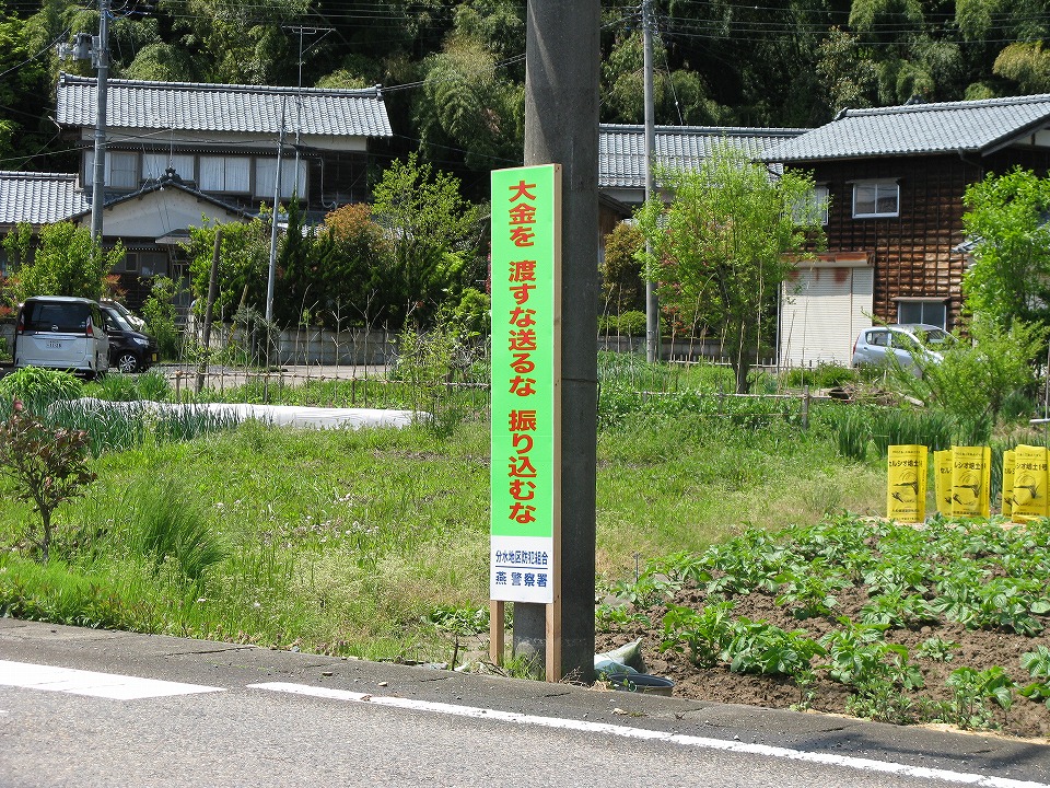 | 新潟市のアジトでの「超大掃除」が中途半端に終わり、上越に向かう。 その途中で見つけた標語。 俺なんかこういう話が来ても、 渡したり送ったり振り込む大金がそもそもない(笑)。 |