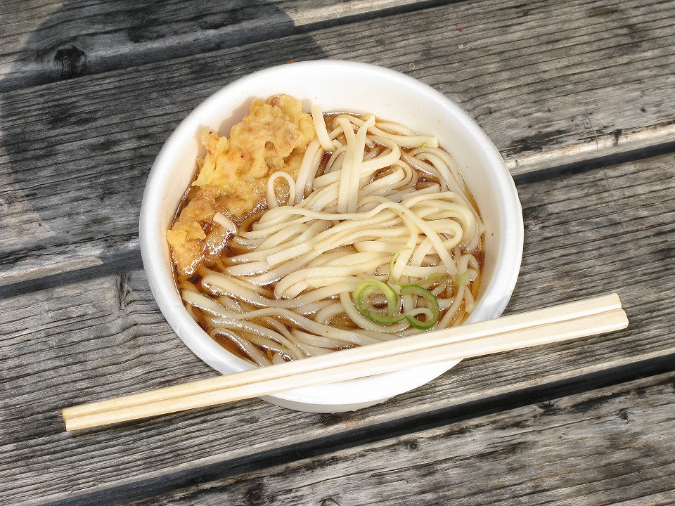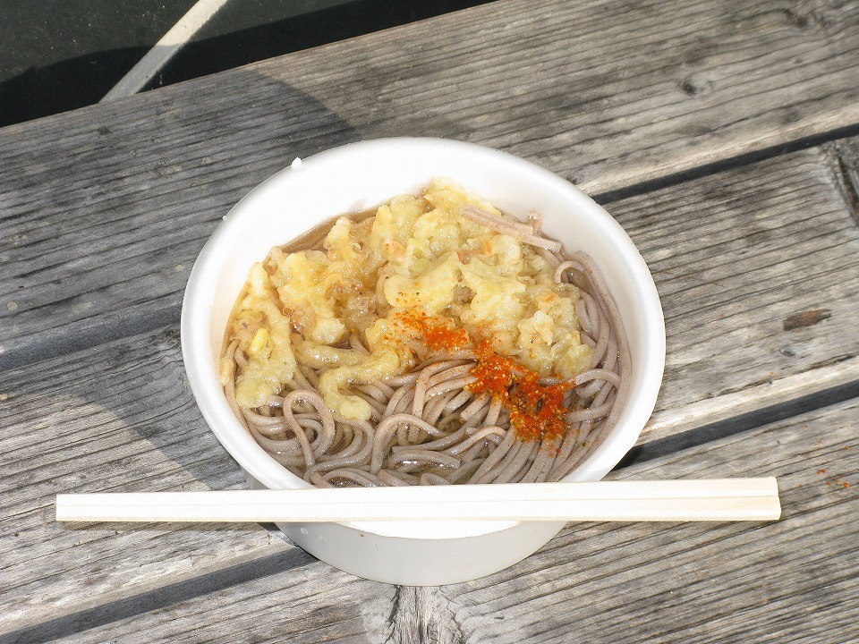 | 314Mの通過時刻が迫っていたので 後回しにしていた朝メシ。 当然、う・そ自販機の天ぷらそば250円ナリ。 |