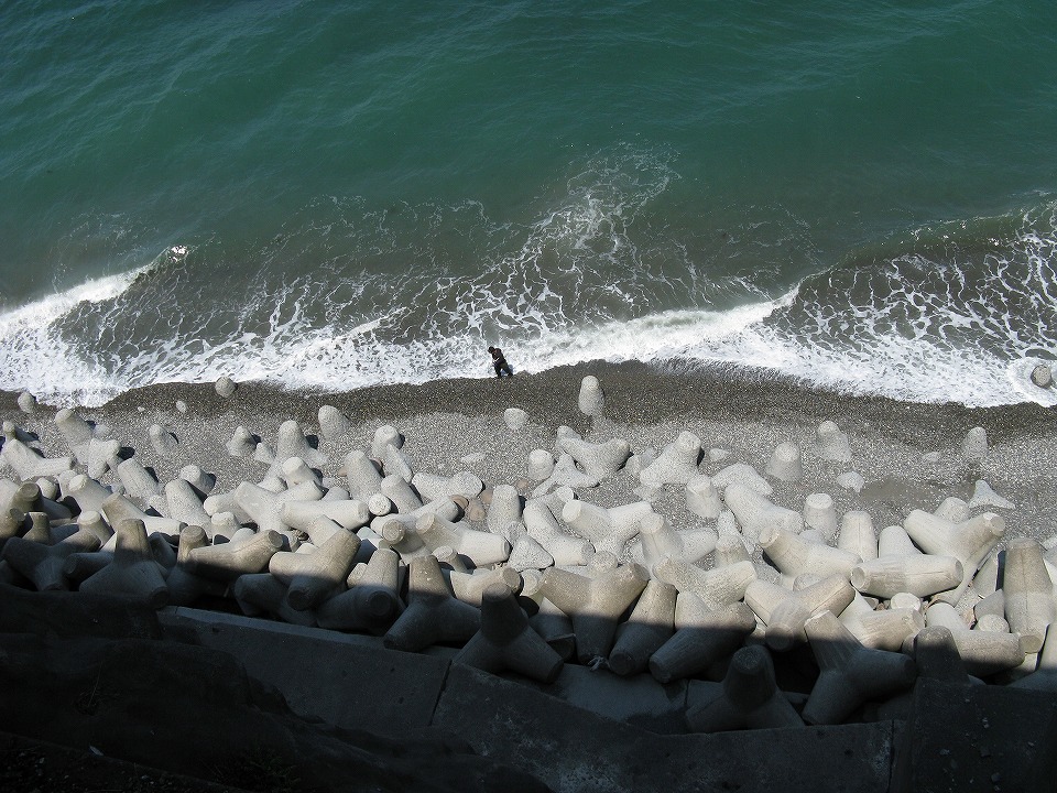 | 前からこの区間の下を覗いてみたかったので 信号待ちの間に写真を撮ろうとクルマから降りて見てみたら、 なんと人がいた! これは驚いたゾ。 俺はてっきり直接海になってるもんだとばかり思っていたが、 小石の浜になっていたんだね。 この人は何かを探しているようだったが、ヒスイでも探してんのかな。 干潮から約2時間程度だったので人が通れたのかもしれない。 満潮時はどうなんだろうね。 |