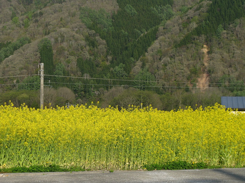 | 白馬村内の国道沿いにあった菜の花畑。 さっきの「急行4号」はこれぐらいの菜の花と撮りたかったね。 ちなみにこの畑の向こうは大糸線。 |