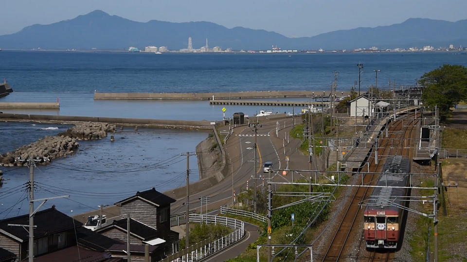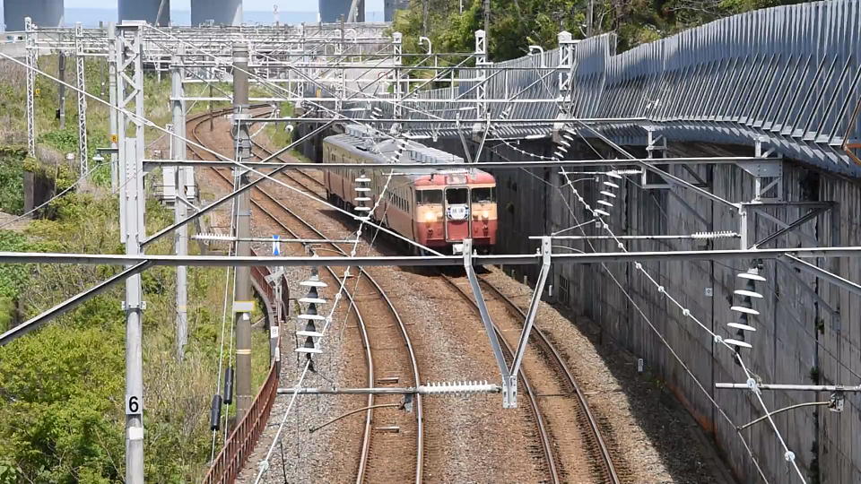 | 市振で折り返してきた「急行2号」も親不知で撮影。 ゆっくり走る約46秒の動画はこちら。 ど~でもい~けど、電車が画面の左に消えたタイミングで 走行音が入っているが、これはちょうど国道8号を走ってきた キャンピングカーと大型トラックのもので、電車の音ではないよ。 |
