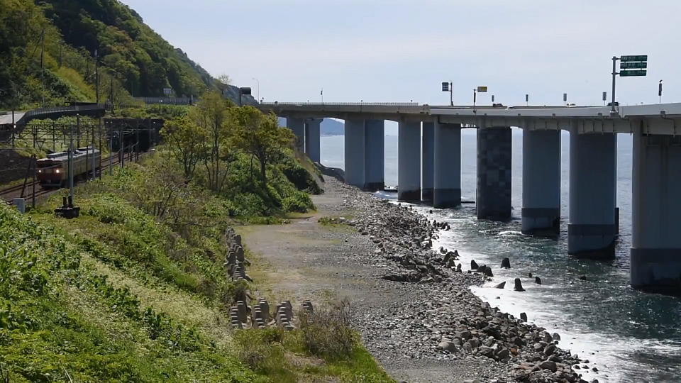 | いつものように高速で急行沿線に転戦し、 親不知で「急行1号」を撮影する。 前回は広角気味に周りの風景も入れたが、 今回はいくらか"トレインファースト"にしてみた。 しかし、ビームなどの邪魔が目立ち、 いったんアングルを決めたものの気になり、 ちょこちょことセッティングし直してたりしていたら電車が来てしまい、 だいぶ近付いてから録画を開始したので中途半端になってしまった。 完全な失敗作だ…。 そんな情けない約20秒の動画はこちら。 |