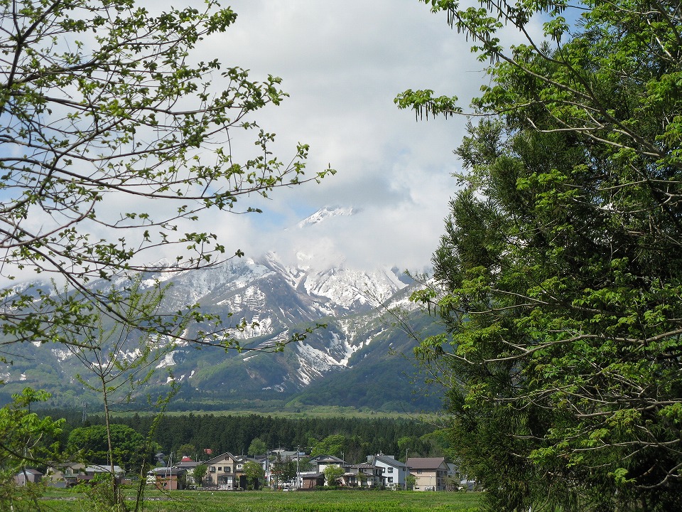 | 天気はいいが、期待した妙高山は雲がかかっていた。 これも中途半端だ…。 この写真は手前に新緑の木々をあえて入れた。 |