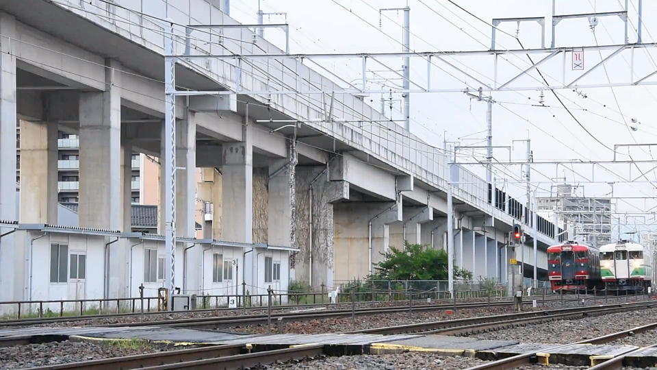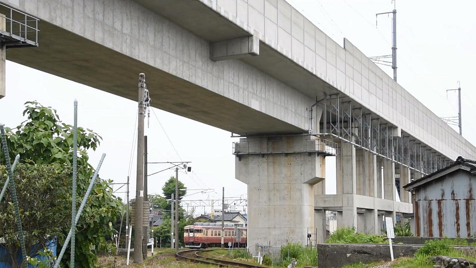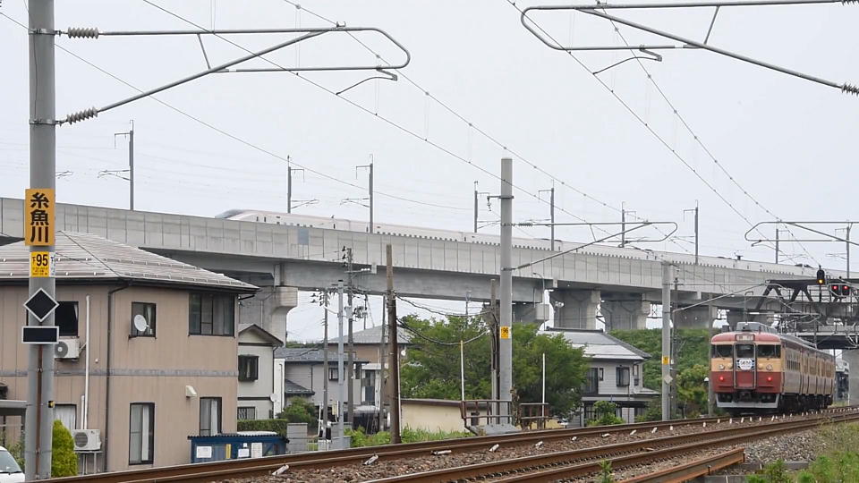 | 快速の撮影後に2軒でラーメンを喰っていたら ちょっと時間を食っちゃったので(当たり前だろ!)、 高速で糸魚川に移動した。 糸魚川駅の西で、非電化区間である南小谷以北の存続 が危ぶまれている大糸線が分岐するが、 その線路脇から「急行1号」を撮影。 北陸新幹線の高架もわざと入れた。 約24秒の動画はこちら。 |