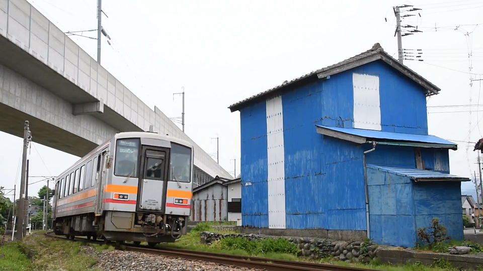 | 【おまけ】 「急行1号」のあと、ちょっと待つと南小谷からの大糸線427Dが糸魚川に到着するので、 車両の魅力は全くないが、ファンキーな色の建物も入れて一応撮影しておく。 約20秒の動画はこちら。 結構、客が乗っていたよ。存続問題が出始めたから 乗りに来てんのかな(笑)。 |