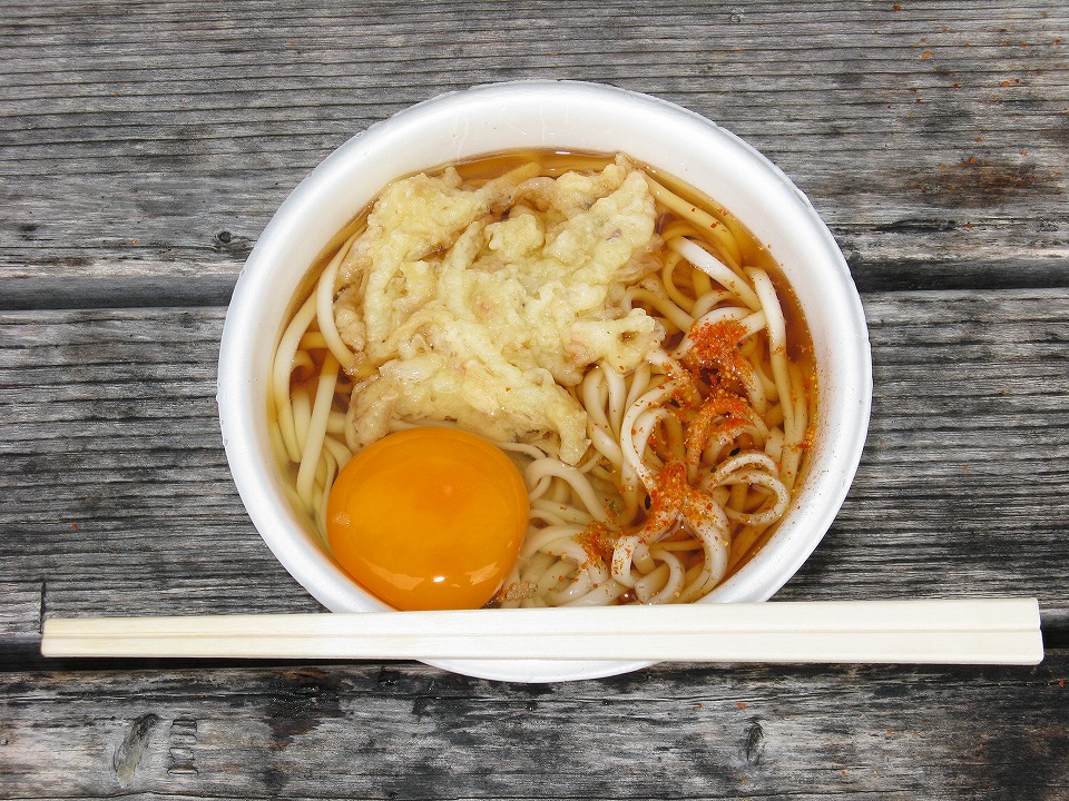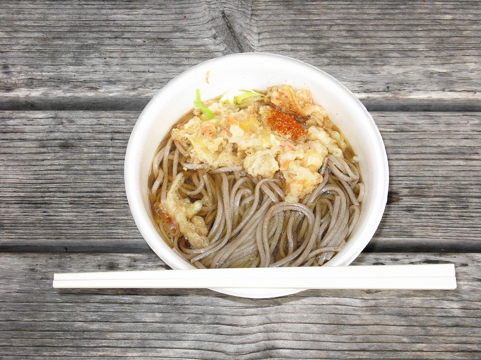 | ってことで、今日も「う・そ自販機」の天ぷらそば250円ナリで朝メシ。 今回は丼が出てきた時からネギがこんにちはしていたよ。 |