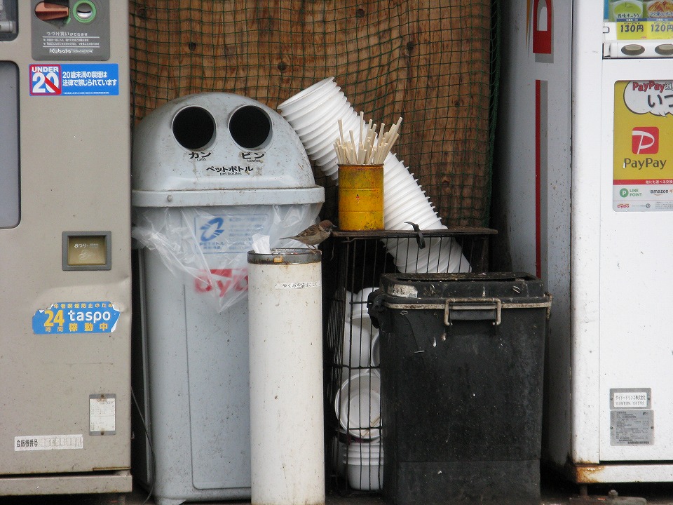 | スズメが朝メシを喰いに来ていた。 黒い縦長の箱は残飯捨て用で、 上部にアミが貼ってあり、つゆは下に落ちるが、 食べ残しはアミに残る。 それをつつきに来るんだね。 でも、天かす状の天ぷらばっかしつついてると、 脂肪過多になるぞ~。 |