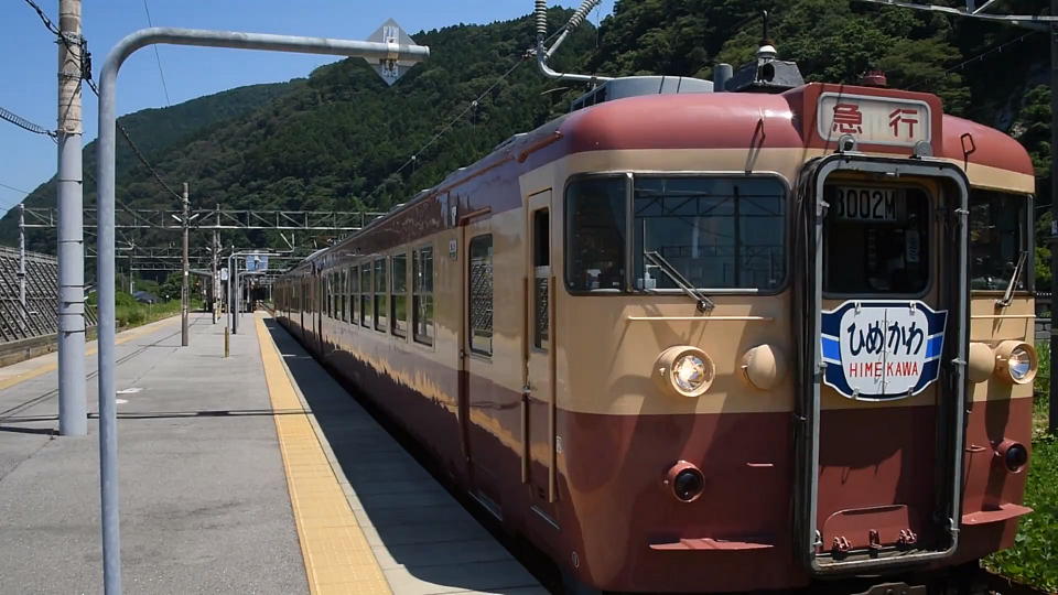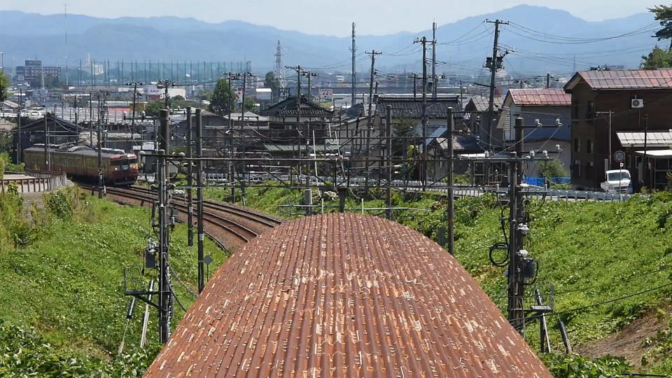 | しばらくの停車後、「急行2号」となって直江津に向かって発車する。 古そうなレンガの建物も入れてみたよ。 約42秒の動画はこちら。 |