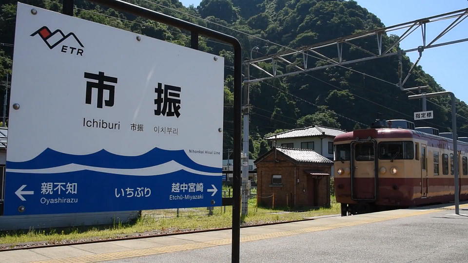 | 「急行2号」が市振駅に到着した。 停止位置を考えてカメラを構えていたが、 先頭車がギリッギリで画角に収まった。 約39秒の動画はこちら。 |
