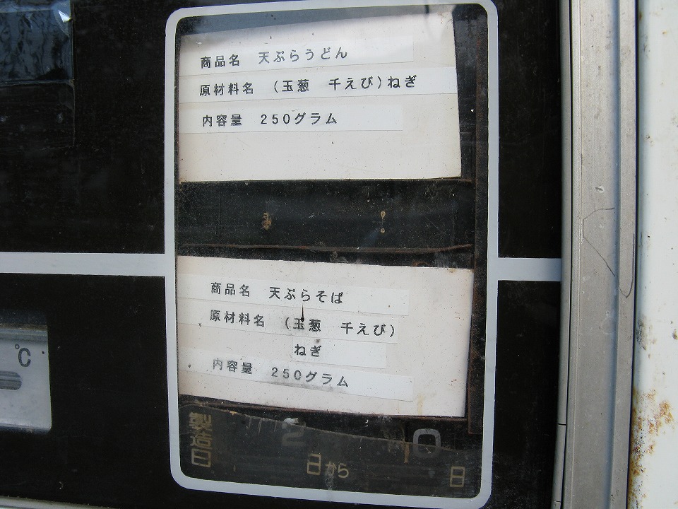 | おはよ~さんです。 今日こそは「う・そ自販機」で朝メシを喰うゾと またやってきたら、今日はうどんもそばもありました(嬉)。 写真はうどんとそばの原材料の表示。 天ぷら(かき揚げ)の原材料…というか具のみを表示している(笑)。 「干えび」が「千えび」になっているのを見逃してはいけない。 えびが千も入っていたらいいな~(丼から溢れちまうだろッ。)。 |