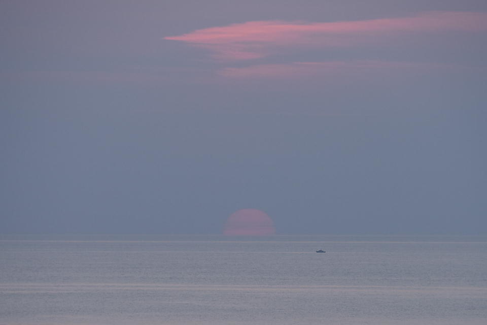 | 新潟でちょろちょろとあちこち回って用事を済ませ、 上越に向かう途中、鯨波海岸で日没を迎えた。 きれいさには欠けるが、珍しく水平線に太陽が沈んだ。 このように水平線に沈むのって、年に数回しか見られないんだよ。 |