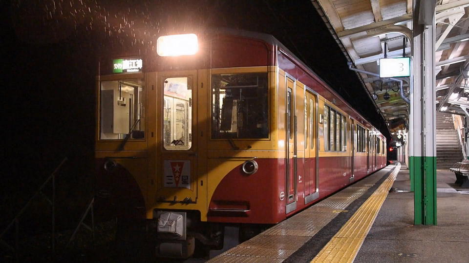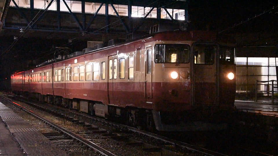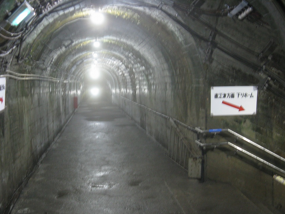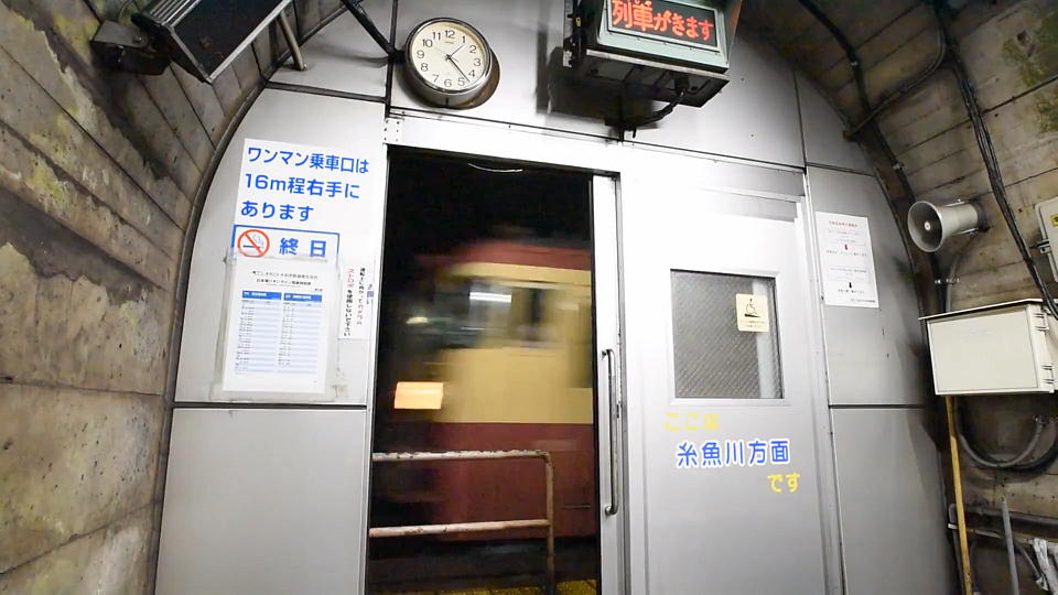 | 太好了(やったね)! 糸魚川方面の上りホーム(=「夜行急行」が通過するホーム)に時計があった! 1時間ほど深夜の地下の待合室で1人寂しくぼぉ~と待っていた。 そして、01:10に直江津を発車した「夜行急行」が、いいスピードで筒石を通過していった。 ちゃんと時計も入れることができて、ひとまずはよかったが、画的ににはどうなんだか…。 この時刻なら「夜行」って分かるでしょ。 でも、あとで気が付いたが、トンネル駅の筒石ならいつも同じ明るさ(暗さ)だから、 「13:23じゃないの?」と言われても返す言葉がない…。ホントに01:23なんだよぉ。 約11秒の動画はこちら。 ホームへのドアを開けっ放しにするな、とのことだったので、 電車の通過直前に開けて、通過後はすぐに閉めました。 さて、もうだいぶ眠いので、市振発の折り返しの「夜行急行」の撮影はパスして、 朝、「夜行急行」が鈍行になって妙高高原に向かう様子の撮影に備えて 沿線の近くまで移動しておき、どっかで寝るゾ。 |