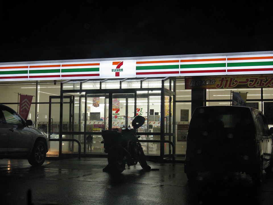 | 晩メシをまだ喰っていないので、ハラが減りまくっている。 国道沿いのイレブン屋で調達。 |