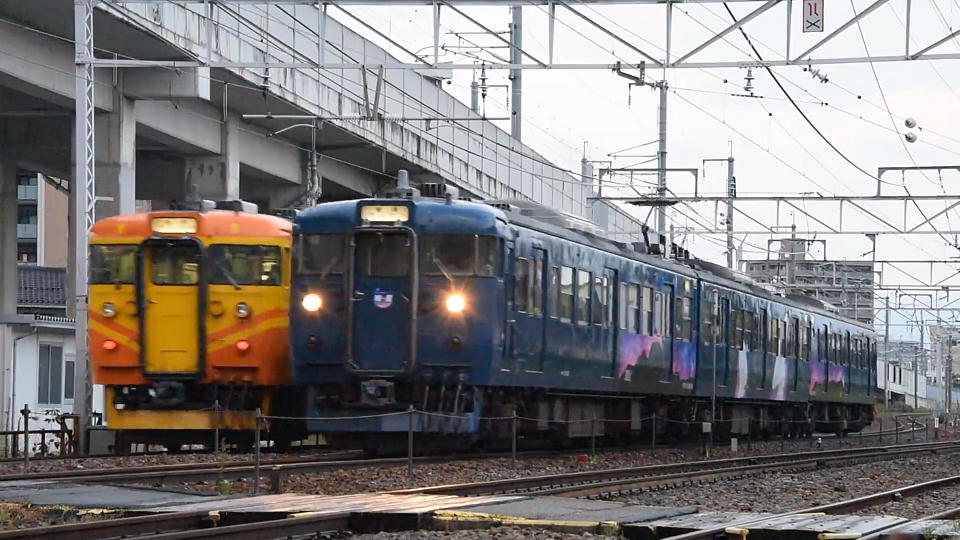 | 自宅に帰り、朝酒と朝湯をして、このページを作る準備をしてから朝寝をしたら、 起きたのが14:15だった…。よく寝たな。 んで、このページを作っていたら、いつもの夕方の115系のすれ違いの時刻が近くなったんで、 1枚↑の、朝の115系で〆のつもりだったんだけど、今日も撮影にやってきたよ。 ちょっと前までかなり激しい雷雨だったのだが、もう青空が覗いている。 今日はいつも目安にしている2つの踏切の鳴り始めのタイミングが よくあるパターンとは異なっていたので、とっさの判断で"引き"のアングルに変えた。 これが功を奏して、辛うじて顔の並びが撮影できた。 ほぼ「ばっちぐー」でしたね。 約29秒の動画はこちら。 【余談】 まだ晴星が画角に入ってこないうちから録画を開始してたんだけど、 ちょうど犬の散歩のおじさんのズルズル歩く音や犬の息づかいが入っちゃったんで動画の冒頭をカットし、 電車が通り過ぎ踏切が開いたらこのおじさんが渡り始めたので、その部分もカットしている。 このおじさんがいなければ電車が現れてから消えるまでのいい動画になったのに…。 ま、みなさんが生活しているエリアなのでしかたないですね。 |