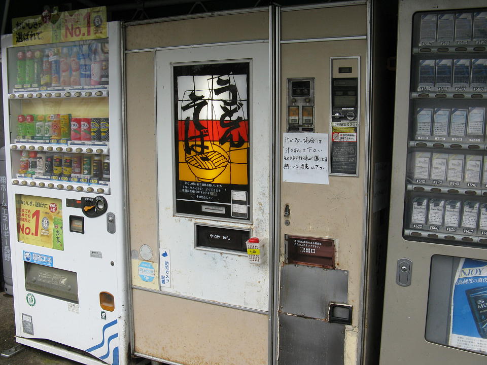 | 一般的な勤め人にゃ、2週連続の3連休の2回目。 天気がよけりゃ、楽しい撮影行になるんだが、 台風15号が近付いてきていて基本的に雨の予報だ。 今日は、台風15号がまだそれほど近付いていないので、 朝の時点ではそぼ降るレベルだったから、思い切って撮影に出てみた。 雨が降っていても、当然「う・そ自販機」で朝メシにする。 |