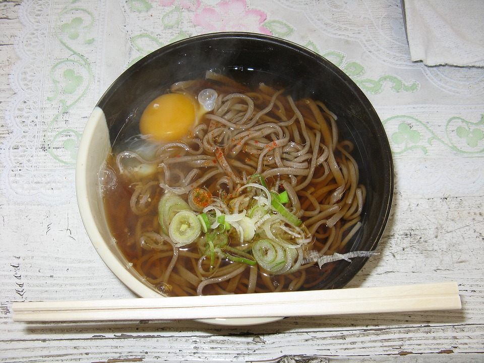 | 帰りしな、たまにはと黒姫駅の駅そばに来てみた。 月見そば(駅そば)370円ナリ。 こんな小さな駅に駅そばがあることを貴重に思わないといけない。 |