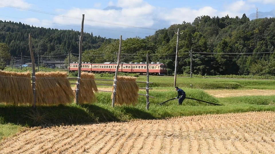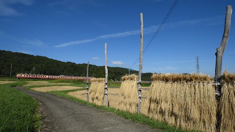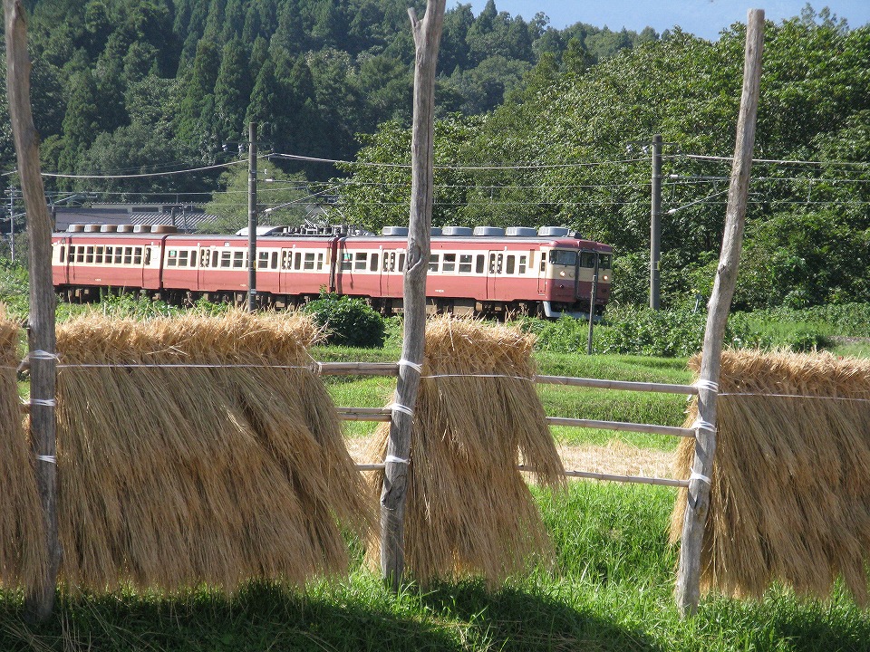 | 今日の「お題」は「はさかけ」。 地域によっては、はざがけ、はぜかけなどとも。 要は刈り取った稲を乾燥させるために干す行程だ。 秋のいい風景なので、「はさかけ」入れて是非撮影したいと思っていた。 特に快速沿線には田んぼが多いので、簡単に撮影できるだろうと高を括っていたら、 これが全く見当たらないのだ。 俺はそれなりに沿線に通っているので、田んぼの場所は分かる。 妙高高原からほぼ線路沿いに直江津までナメてみたが、はさかけはなかった(はず)。 実は「どこで撮影しようかポイントに迷うな~」というほどの状況を想定していたので、ちょっと焦った。 そしてやっと見つけたのがこの場所。 でも、稲が少ない…。 ホントは「はさ木」(タテの木)の上段にも横棒を括り付けて2段ぐらいにしてほしかったな~。 でもまあ撮影できたからよしとする。 上り快速の約29秒の動画はこちら。 |