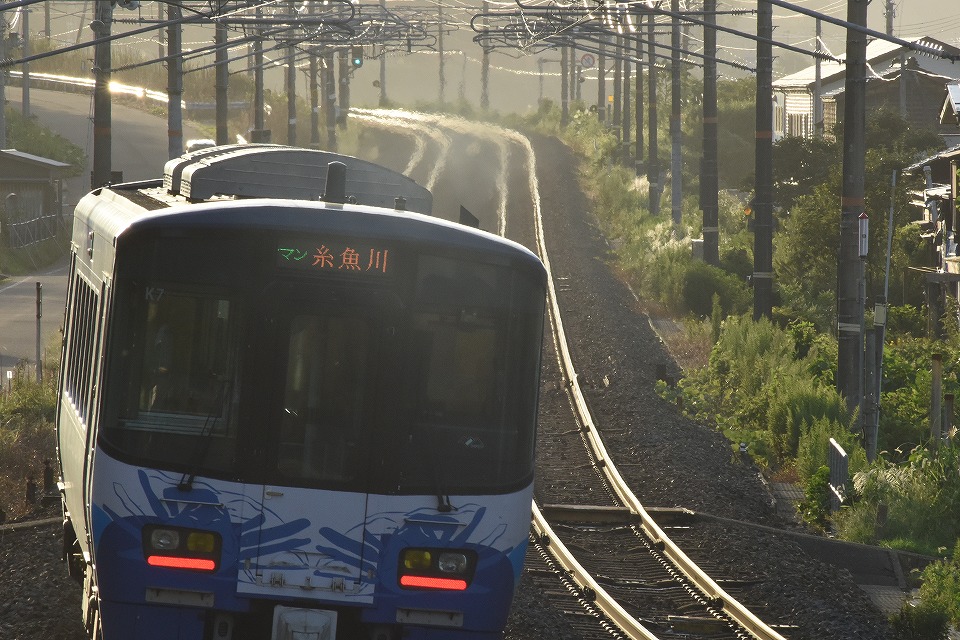 | 「急行4号」は谷浜で逆光で撮影する。 この写真は練習で撮影した1648D。 実際は連写で何十枚も撮影しているのだが、 それを見ていた通りすがりの散歩のおばちゃんが、 「(この鈍行について)なんか特別な列車なんですか?」と聞いてきた。 「いえ~そういうわけではないんです…」と答えると、「はぁ、そうですか…」と言って歩いて行った。 うう~、さぞかし「マニアってヘンなヤツ」と思われたんだろうな~。 ツラい…。 でも、おばちゃん相手に455系のことを話しても分かんないだろうしな~。 「この後に来る旧い電車の撮影の練習でした」ぐらいに言えばよかったかなと 後になってから思ったよ。 |