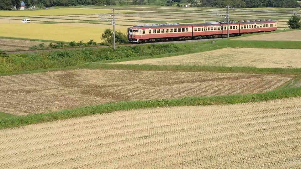 | 上り快速は、俯瞰ポイント(南)で、稲刈りが終わった田んぼを入れて撮影。 約18秒の動画はこちら。 |
