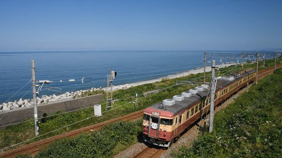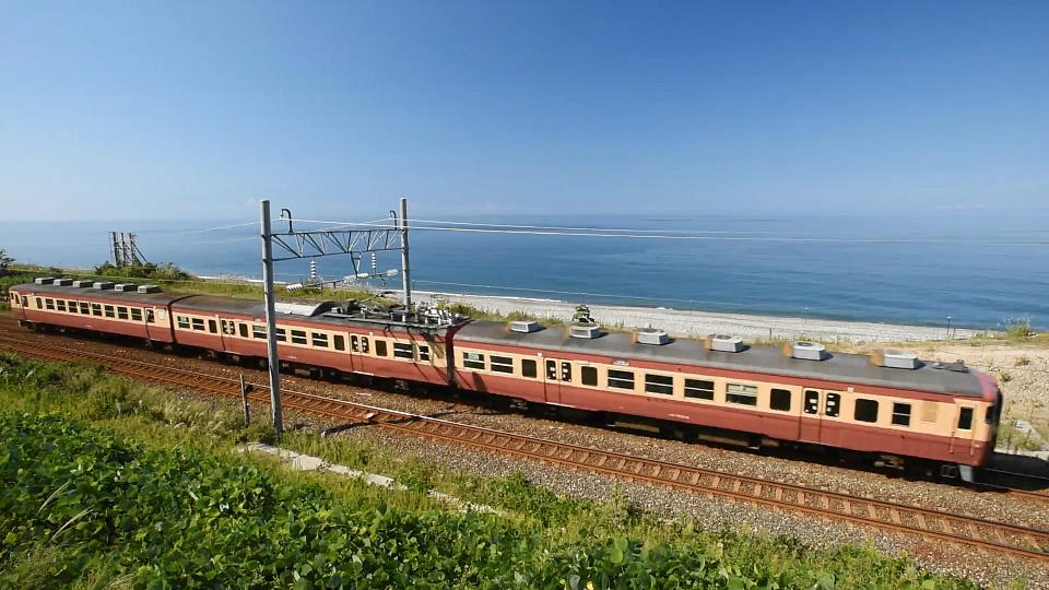 | 市振で折り返してくる「急行2号」は、 国道8号をちょっと青海駅方面に戻った辺りの海っ端で、超広角で撮影。 約16秒の動画はこちら。 |
