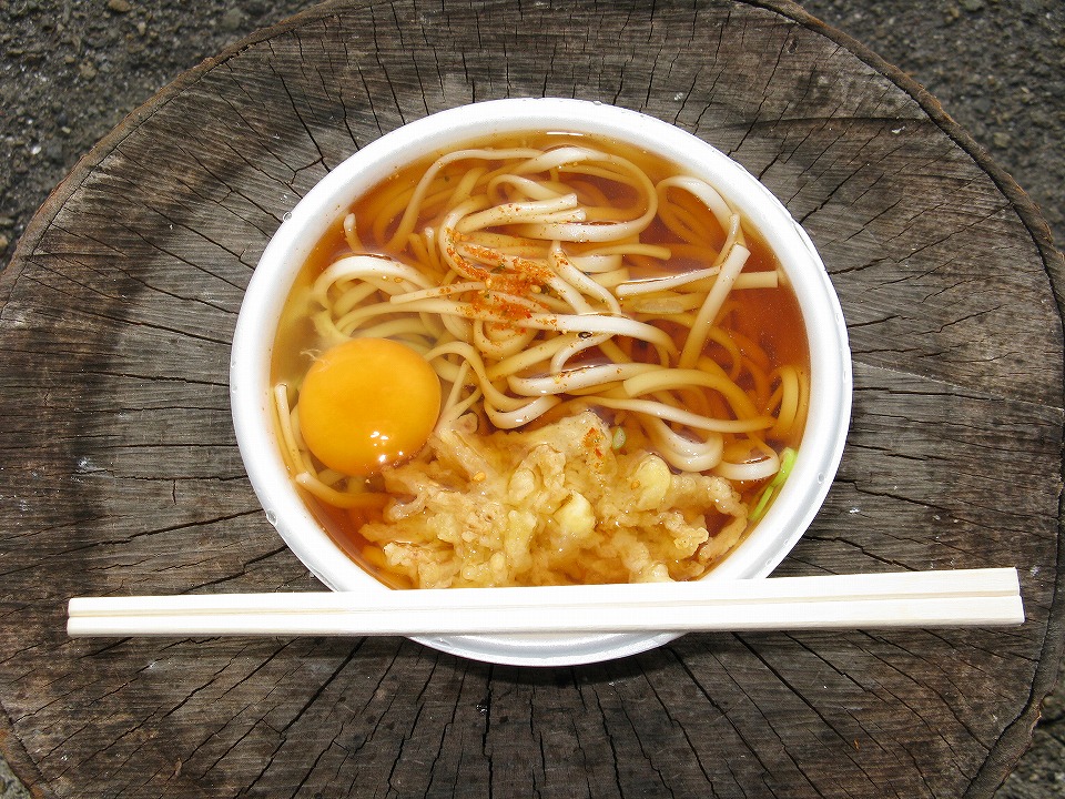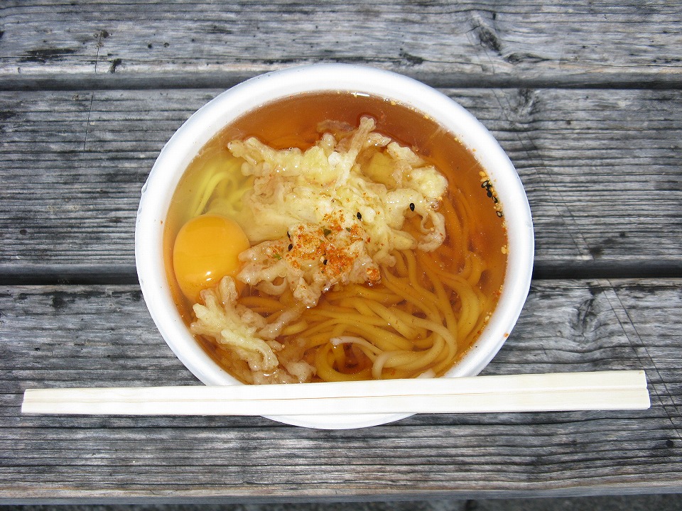 | 10月に入り、早速1日(土)と2日(日)が週末で、この2日間ともよく晴れそうな予報だ。 土曜日の今日は先輩もご同行くださる。 まずはいつものように「う・そ自販機」で天ぷらうどん250円ナリ。 今日は自宅から生卵を持ってきて月見にした。 |