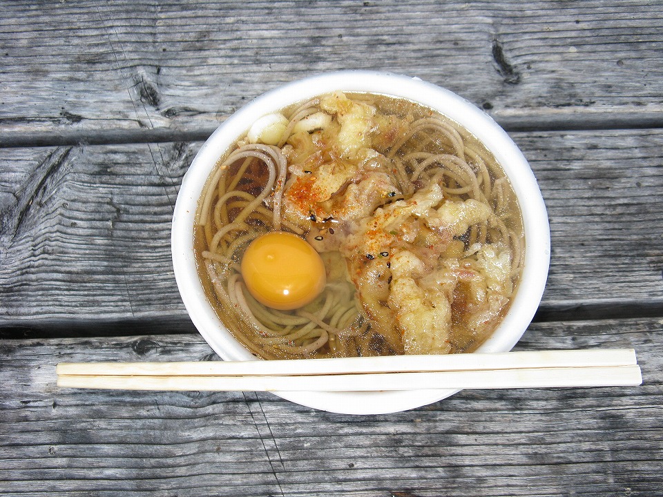 | 当然?天ぷらそば250円ナリも続けて食す。 こちらも月見にした。 ってことは、最初から2杯食すつもりで卵を2ケ持ってきていたということですね。 バカですね(笑)。 |