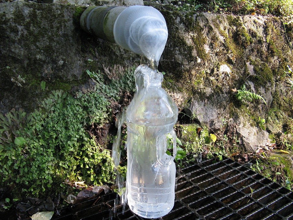 | 「う・そ自販機」の次は、お気に入りの大田切清水で水汲み。 最近ちょっと混じり物が目立つので、100均の排水口用ネットを5枚重ねにして汲んだ。 それでも僅かにボトルに「湯の花」的なのが入った。 まいっか。 |