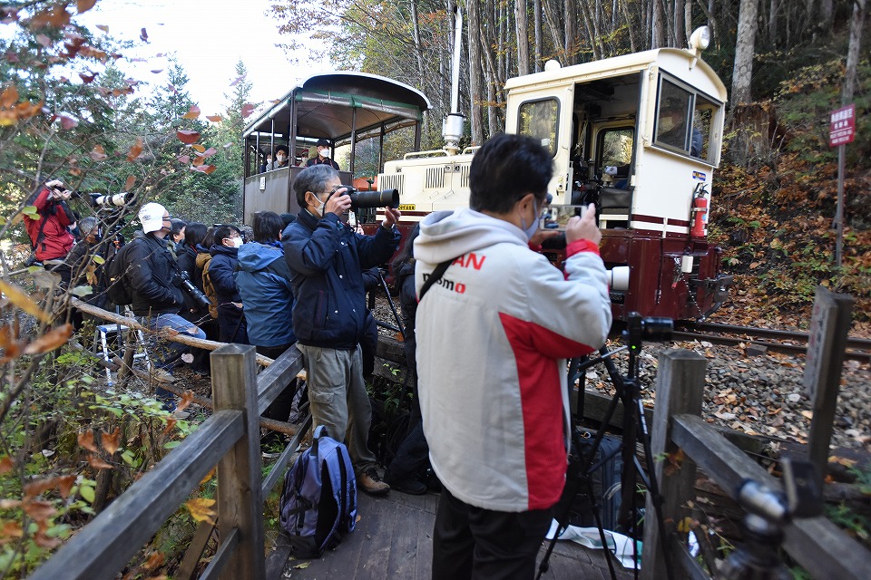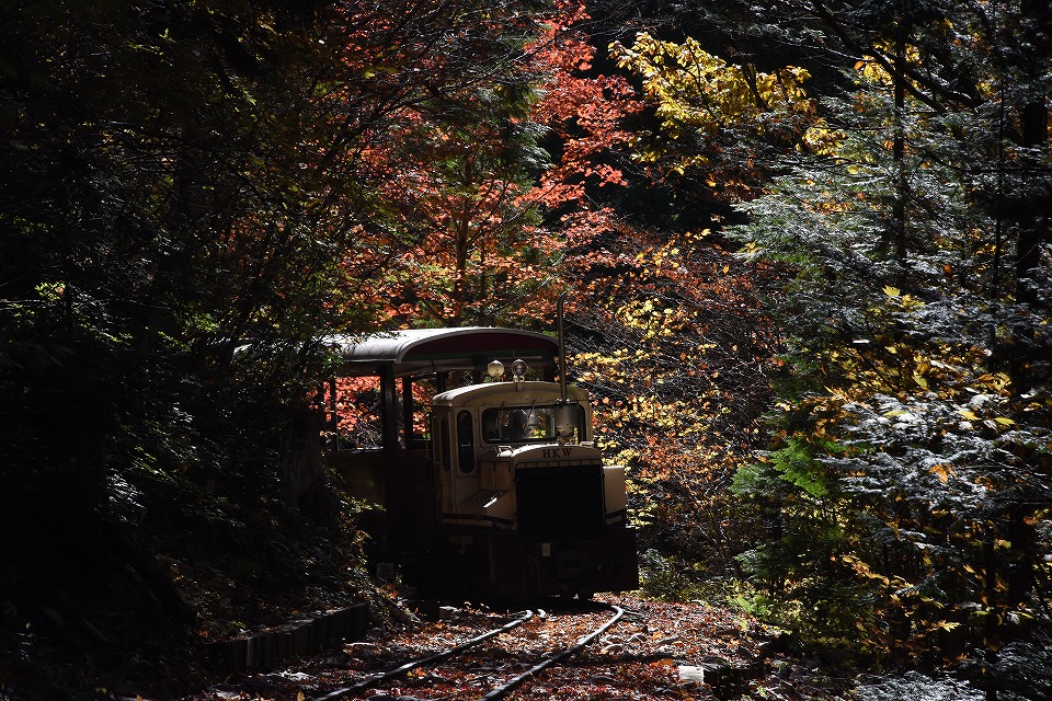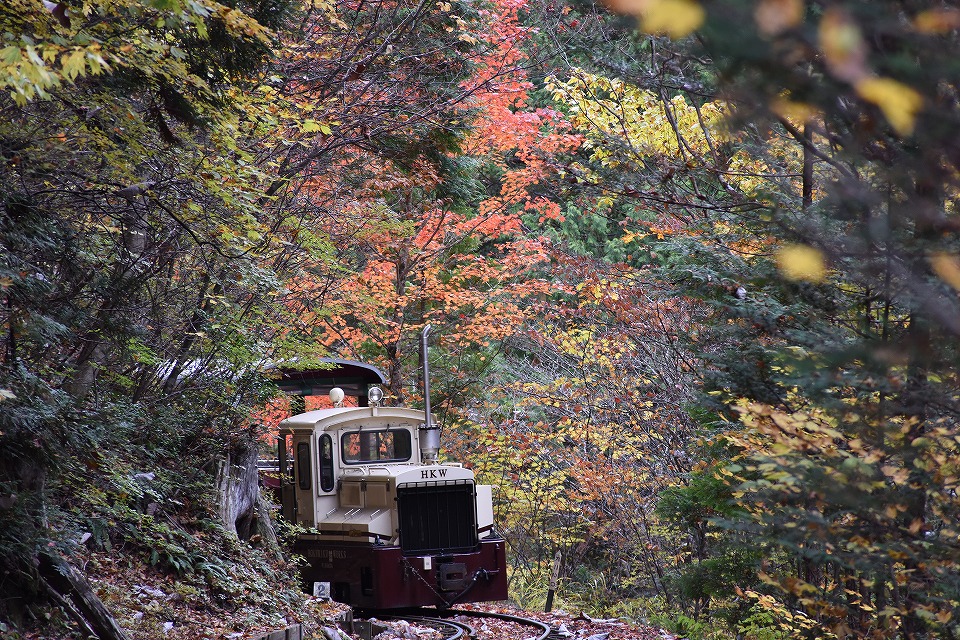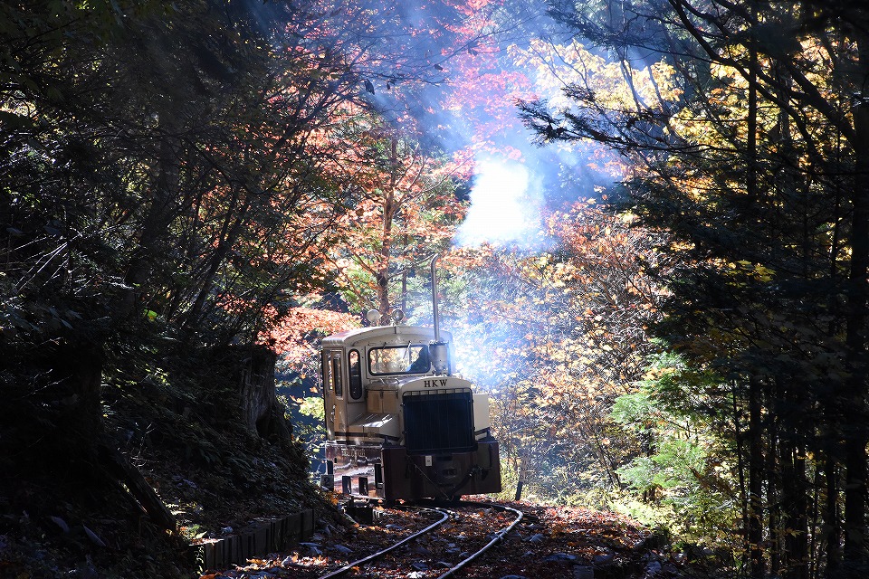 | 朝メシが終わったら、赤沢に移動して、中立橋のたもとにカメラを据えた。 森林鉄道沿線で赤い「紅葉」が見られるのは、ほぼこの地点のみ。 職員さんによれば、今年の色づきは「あまりよくない」とのこと。 9時過ぎに点検用のDLが逆機の単機で、エンジンを唸らせ排気ガスを吐きつつ出発していった。 撮影の練習をしたのだが、明暗の処理が難しいことに気が付いた。 「気持ちいい快晴だ!」と呑気に喜んでいたのだが、このあとの旅客列車をうまく撮影できるかな…。 ところで、パンフなどでよく見るこのポイントには、7時過ぎに既に5~6人が場所取りをしていた。 たかだか施設内の観光森林鉄道の撮影で場所取りをするとは…。 俺のようなヤカラがいるからか(苦笑)。 |