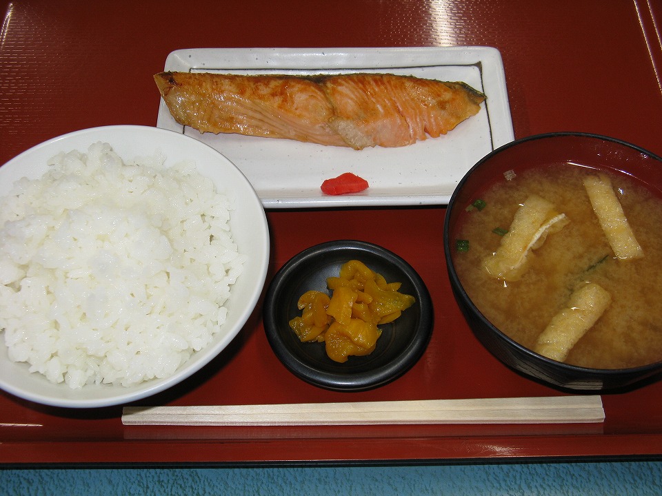 | たくさんの献立から迷いに迷って焼シャケ定食550円ナリに決定。 ニッポンジンの朝メシだねぃ。 納豆も付けりゃよかったかな。 |