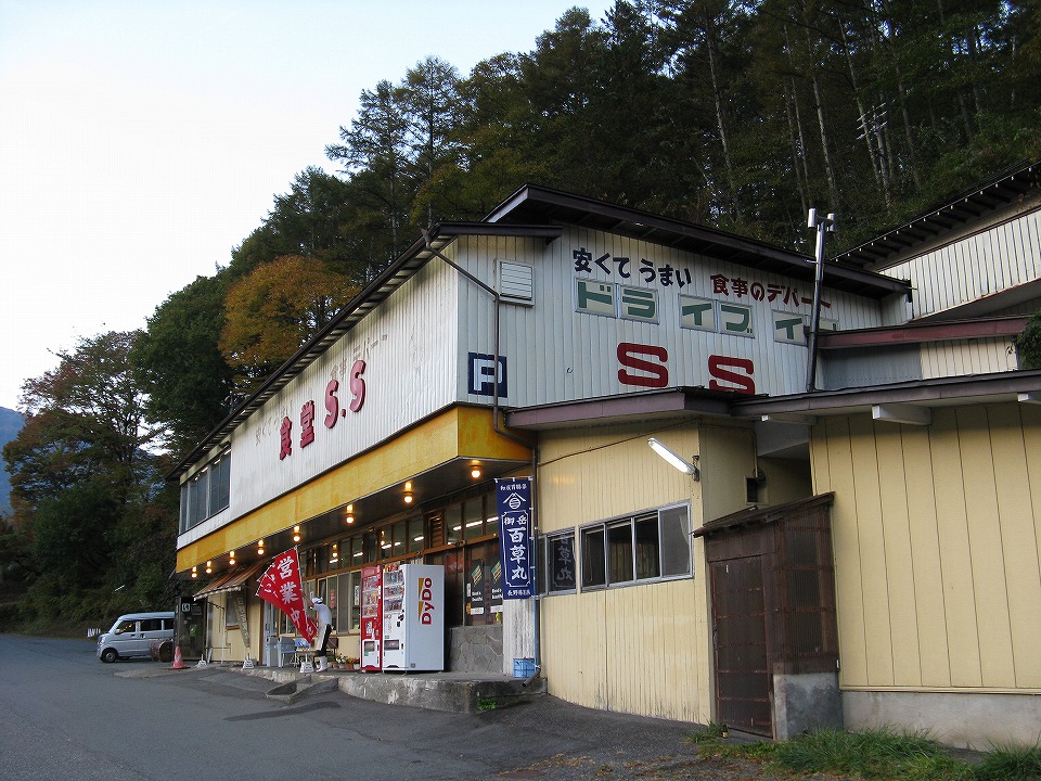 | 455・413系快速・急行の撮影の前日の、おまけの1日からのスタート。 木曽の赤沢自然休養林周辺の紅葉がいい具合のようなので、森林鉄道と撮影したい。 ってことで、朝4時過ぎに長野を出発して、ひたすらR19を走って塩尻まで来た。 ハラが減っているので、朝からやっているお馴染みの「食堂SS」で朝メシを喰うのだ。 ってゆ~か、ここでメシを喰うためにハラを空かしてきたのだよ。 「食事のデパート」ってのが泣かせるねぃ。 ドラ イブ イン ってのもイカす。 木曽の胃腸薬である「御岳百草丸」の幟もいい。 地元のTVでは、♪お~んたけ、ひゃくそうがんっ、っていうCFもあったけど、最近観ないな…。 「営業中」の幟を、オヤジさんが立てている。 昔のデパートの大食堂ヨロシク、硬券の食券でも扱ってくれてればいいんだけど、 それはないです。ただ、店名入りのアナログの伝票は健在だョ。 |