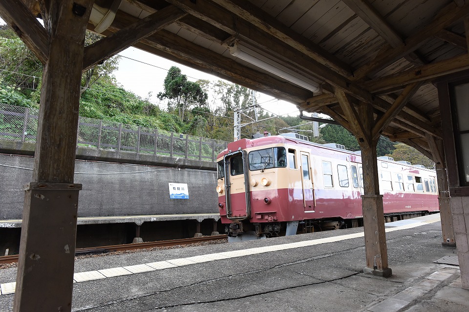 | 発車まで時間があることが分かったので、 クルマに戻ってデジイチを引っ張り出してきた。 そしたらちょうど発車になり、有間川駅の駅名表示板と味のある屋根下を入れて撮影。 動画のセッティングは間に合わなかったのよ、残念。 |
