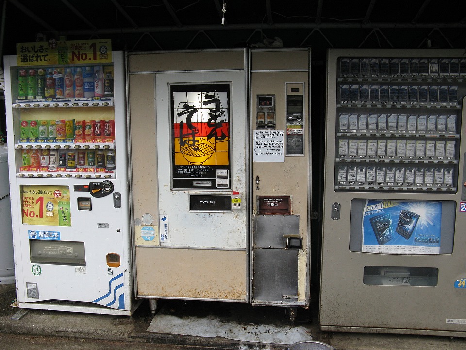 | 明けて日曜日。 ちょっと前までの天気予報ではいいお天気のようだったんだけど、 信州は朝から霧雨で、新潟県境に近い信濃町(駅でいうと黒姫。)では、しっかり降っていた。 それでも、信濃町のいつもの「う・そ自販機」で朝メシを喰うもんね。 ってことで現地に来てみたら、幼稚園ぐらいの女の子2人を連れた家族や、 半分ヤンキーみたいだけど、クルマには正直に初心者マークを付けたにーちゃんたちが、列をなして購入していた。 |