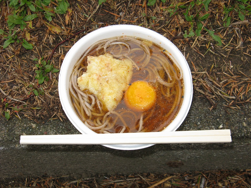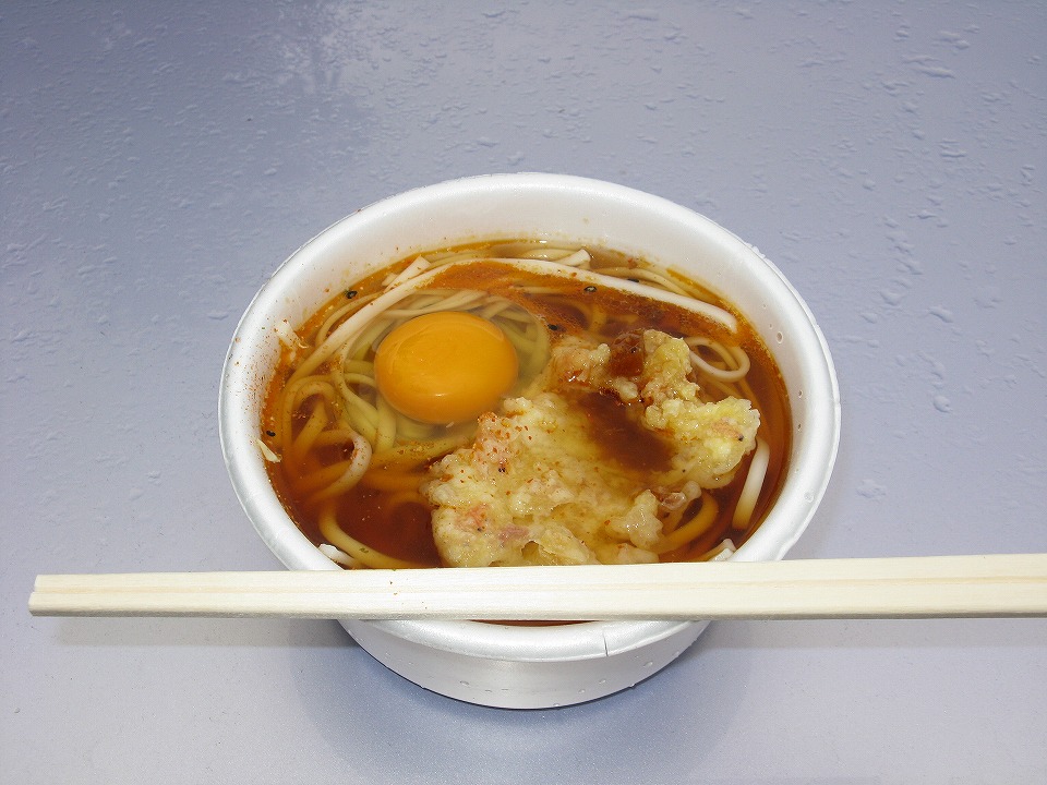 | 今日は初の試みで、カレーを出汁で薄めて持って来た。 この写真はカレー月見うどんになってるんだけど、 月見はともかく、カレーの部分は全然分かんないね(笑)。 あ、生卵も自宅から持って来ました。 |