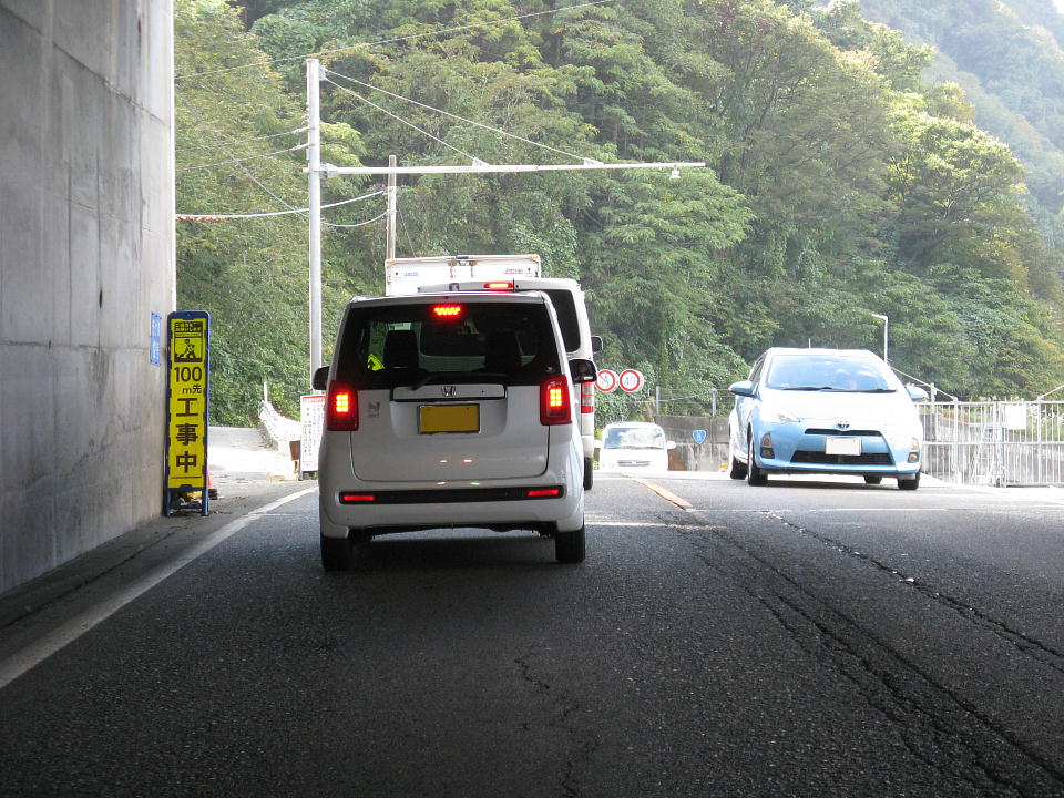 | 快速の撮影後は、急行沿線に転戦する。 高速で糸魚川まで来て、青海や親不知を見て回ったが、全然紅葉していない。 ところで、駅でいうと、 ①:青海~親不知 ②:親不知~市振 の区間で、路線に並行するR8で工事による片側交互通行が行われていたのだが、 この日(2022/10/30)現在、①はなかったが、 ②は相変わらず実施されていた(写真)。 「追っかけ」でこの区間を通ることを目論んでいるテツは気を付けてね。 場合によっちゃあ、糸魚川I.C.から北陸道で富山の朝日I.C.まで行って、 R8で新潟県に戻る方が早いこともあるよ(経験者)。 |