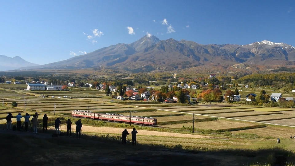 | 下り快速は、俯瞰ポイント(北)にて。 テツがたくさん集まってきていたのでわざと入れて撮影した。 山々が少し霞んできていたのでPLフィルターを使ったが、 その効果のカバー領域が広角の画角を賄いきれず、空の左側に効果が及んでいない。 約20秒の動画はこちら。 妙高山の右の山(恐らく焼山)はもう雪をかぶっている。 そろそろ冬の足音が聞こえてくるね。 |