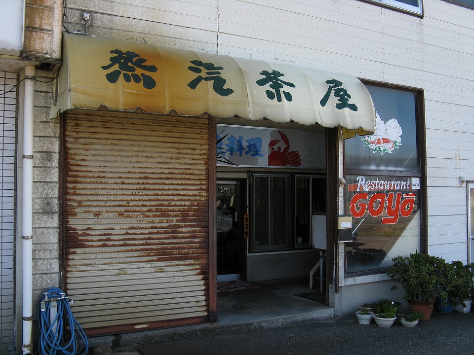 | 快速沿線の山線から急行沿線の海線に転戦する。 糸魚川まで高速で来て、紅葉を撮影できるところはないかとロケハンしたが、基本的にダメだった。 「急行1号」の撮影の前に「蒸汽茶屋」で昼メシにする。 この写真はメシの後に昼の部の営業が終わった時に撮影したもの。 |